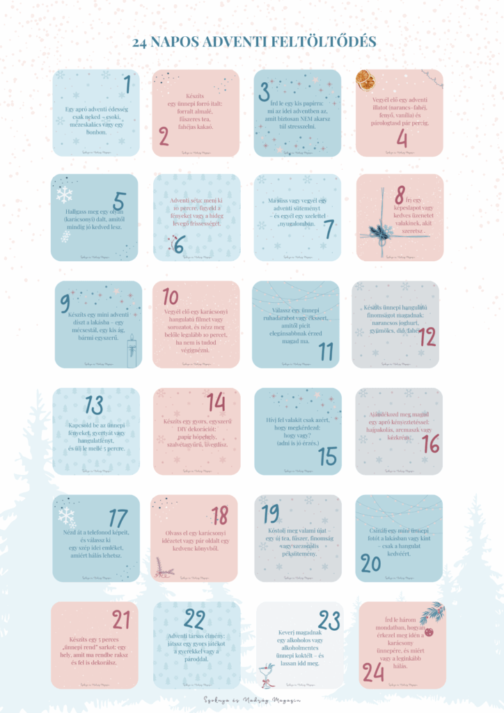 A karácsony előtti időszak gyakran zsúfolt, és a szülők sokszor magukra hagyják az ünnep lényegét: a meghitt pillanatokat. Ez az adventi naptár azért készült, hogy minden nap jusson egy apró öröm, egy kis kreatív szünet, egy falat finomság vagy egy pár perces feltöltődés, ami segít visszahozni a várakozás varázsát. Írtunk erről egy külön cikket és készítettünk hozzá egy letölthető kártyát is: ITT.